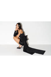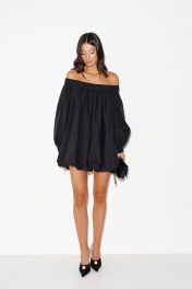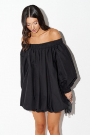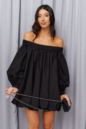 Платье прямого свободного кроя с полуоткрытими плечами, выполнено из черного хлопкового полотна. Характеристики: прямой свободной крой, подкладка, верх и низ изделия на резинке, рукав обьемный, по низу рукова резинка. Длина по спинке 70 см, длина рукава от края горловины 58 см.