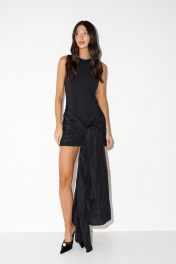 Платье-мини прилегающего силуэта. Выполнено из трикотажной ткани чёрного цвета. По низу платья декор в виде банта из тафты, выходящего из боковых швов (бант функциональный: завязывается и развязывается, спереди или сзади на Ваше усмотрение). Горловина круглая. Верхняя часть платья двухслойная, на обтачке. Застежка потайная молния в среднем шве заднего полотна изделия. Длина спинки 83 см