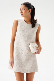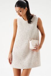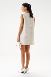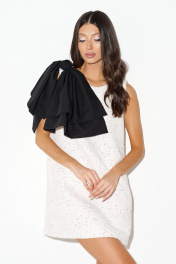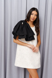 Платье прямого кроя. Выполнено из твида светлого цвета с вкраплениями из цветных пайеток. Декорировано бантом из хлопка чёрного цвета (съёмный на булавке). Горловина овальная. Застежка потайная молния в среднем шве заднего полотна изделия. Длина спинки 79 см