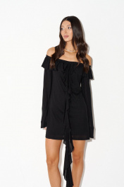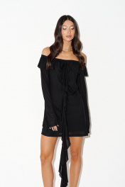 Платье-мини прилегающего силуэта. Выполнено из мягкой полупрозрачной ткани чёрного цвета с подкладом. Верх на резинке, от резинки волан переходщий на спинку. Плечи открытые. По передней части платье декоровано деталью из ткани основного изделия. Рукав втачной, длина рукава 67 см. Длина спинки 70 см