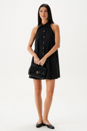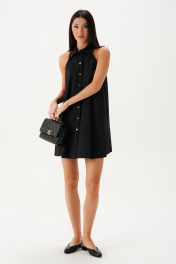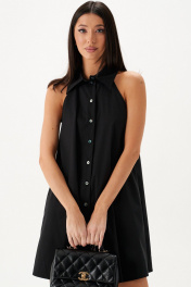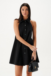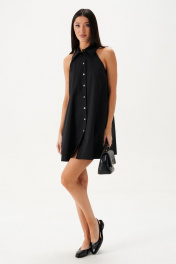 Платье свободного кроя с открытыми плечами. Характеристики: свободный силуэт, застежка центральная на петли пуговички, отложной воротник. В боковых швах карманы. Длина по спинке 80 см.