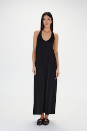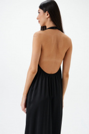 Платье полуоблегающегоо силуэта выполнено из черного полотна. Характеристики: полуоблегающий силуэт, расширенное к низу, цельнокраеная бритель через шею, спинка по верху присборена на резинку. Длина по боковому шву 110 см.