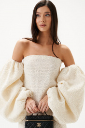Платье прилегающего силуэта. Выполнено из текстильного полотна "гофре". Открытые плечи. Рукава-буфы съёмные, по всей внутренней стороне со сборкой. Длина рукава 66 см. Длина платья по боковому шву 60 см