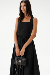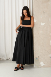 Платье из хлопкового полотна черного цвета. Характеристики: Широкие бретели, юбка свободного кроя со сборкой, в боковых швах карманы, подкладка. Спинка закрытая, застежка - скрытая молния посередине спинки. Длина изделия 115см.