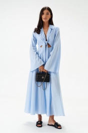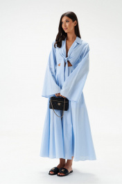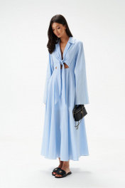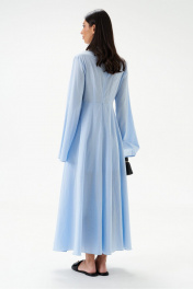 Платье полуприлегающего силуэта, выполнено из текстильного голубого полотна.Характеристики: горловина V образный вырез, грудь фиксируется декоративными детялями завязывающимися на бант, рукав втачной к низу расшмрен, юбка свободного кроя на подкладке, застежка центральная - молния по спинке.Длина платья 130 см, длина рукава 67см.