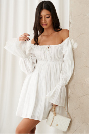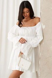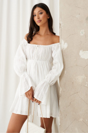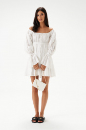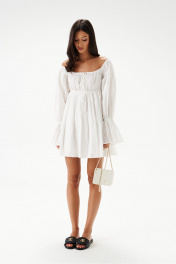 Платье полуприлегающего силуэта с открытыми плечами выполнено из хлопкового полотна белого цвета.Характеристики: полуприлегающий силуэт, подкладка, отрезное, отрез на резинке, горловина и плечи на резинке, по рукаву резинка со сборкой, юбка свободного кроя. Длина от верхнего края изделия 71 см, длина рукава 65 см.