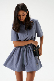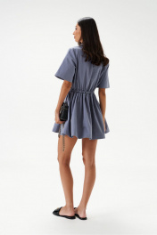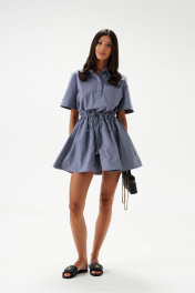 Платье свободного кроя. Выполнено из хлопкового полотна серо-голубого цвета. Без подкладки. Вырез горловины круглый. Воротник отложной, на стойке. Рукав втачной. Застёжка центральная – пуговицы. Слева по линии груди накладной карман. По линии талии отрез на резинке с кулисой со шнурком. Юбка в платье свободного кроя. В боковых швах карманы. Длина рукава от линии втачивания 27 см. Длина спинки 80 см