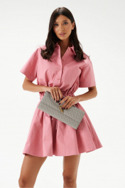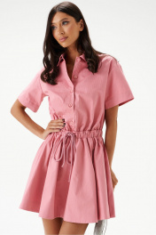 Платье полуприлегающего силуэта, из текстильного полотна розового цвета. Характеристики: полуприлегающий силуэт, по линии талии вставлена кулиса , присборена на резинку, воротник отложной, застежка центральная на планке на петли пуговички, рукав втачной, укороченный. Юбка на подкладке, свободного кроя, в боковых швах карманы. Длина по спинке 85 см, длина рукава 36 см.