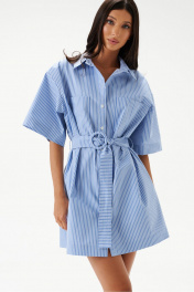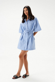Платье-рубашка прямого свободного кроя выполнено из хлопкового полотна голубого цвета в белую полоску.Характеристики: прямой свободный крой, отложной воротник, застежка центральная на петли пуговицы, по линии талии нашиты шлевки, в комплекте пояс на кольцо из ткани основного изделия, по переду кармашки, в боковых швах карманы-хулиганы, рукав свободного кроя, по низу рукава подгиб.Длина изделия по спинке 83 см, длина рукава от края горловины 45 см.
