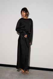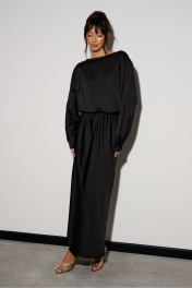 Платье-макси полуприлегающего силуэта. Выполнено из мягкой струящейся ткани чёрного цвета. Без подкладки. Горловина-лодочка. Отрез ниже талии на резинке. Рукав втачной, спущенный, заужен к низу. Длина рукава от линии втачивания 63 см. Длина спинки 146 см