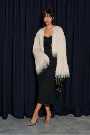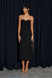 Платье-миди, выполнено из черного текстильного полотна. Характеристики: прилегающий силуэт, верх фигурный, имитация корсета,в среднем шве заднего полотна застёжка - потайная тесьма-молния, подкладка, по задней части шлица 45 см. Длина спинки 99 см