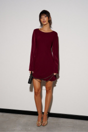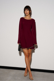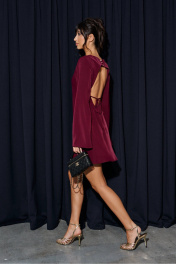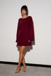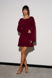 Платье полуприлегающего силуэта выполнено из плательной струящейся ткани бордового цвета. Характеристики: полуприлегающий силуэт, овальная горловина, рукав втачной расклешеный, тонкий подклад. Спинка открытая, с декоративным элементом завязок, сверху застежка на петли пуговицы. Длина по спинке 86 см, длина рукава 68 см.