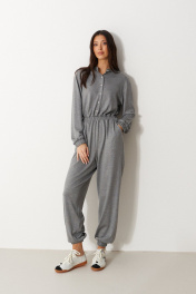 Комбинезон свободного кроя. Выполнен из трикотажа серого цвета. Без подкладки. Вырез горловины круглый. Воротник стойка. Застёжка центральная - пуговицы. Рукав втачной, спущенный, с манжетом на резинке. Пояс на резинке. Брюки с манжетом на резинке. В брючинах наклонные карманы. Длина спинки верха 38 см. Длина рукава (от линии втачивания) 60 см. Длина бокового шва брючины (с учётом пояса) 109 см