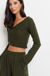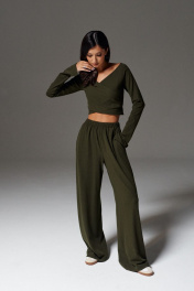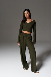 Комплект состоит из топа и брюк выполнен из трикотажного фактурного полотна. Характеристики: укороченный топ, по передней части изделия перекрестный вырез, рукав втачной. Длина по спинке 34 см, длина рукава 68 см от края горловины. Брюки прямой крой, пояс на резинке. Длина брюк 110 см.