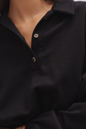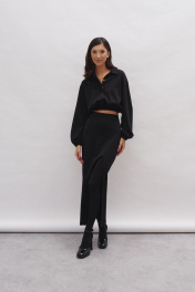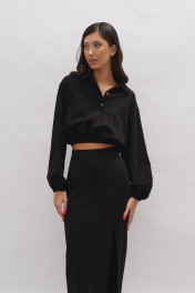 Комплект состоит из укороченного джемпера и юбки выполнен из полотна черного цвета. Характеристики: джемпер - укороченный, свободный крой, отложной воротник, по переду в области горловины застежка на петли пуговицы, рукав втачной спущен, низ рукава на резинке, низ изделия на резинке. Длина джемпера 47 , длина рукава от края горловины 74 см.Юбка прямого кроя, пояс на резинке, по передней части изделия разрез (60 см). Застежки в изделии нет. Длин а юбки 103 см.