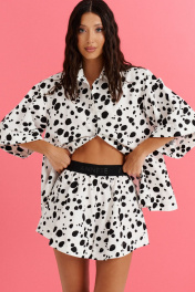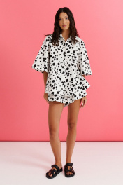 Комплект состоит из рубашка и шорт выполнен из белого полотна с контрастным абстрактным принтом. Характеристики: рубашка прямой свободный крой, воротник отложной, застежка центральная на петли пуговицы, рукав втчаной с разведением к низу. Длина по спинке 63 см, длина рукава 35 см. Шорты прямого кроя, пояс шорт - брендированная резинка, в боковых швах карманы. Длина шорт 32 см.