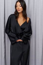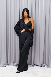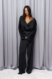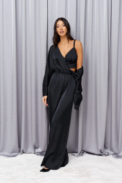 Комплект состоит из комбинезона и топа выполнен из ткани иссине черного цвета. Ваш элегантный смелый образ. Характеристики: комбинезон отрезной по линии талии, по отрезу резинка, верх свободный запах, рукав спущен, застежка потайная тесьма молния в среднем шве заднего полотна. Длина по спинке 152 см, длина рукава от края горловины 72см. Топ укороченный, фигурный вырез горловины, узкие бретели, по спинке резинка со сборкой, по переду под лифом стабильная вставка, застежки в изделии нет. Длина изделия 27 см.