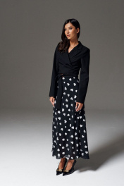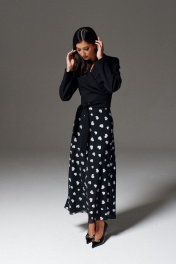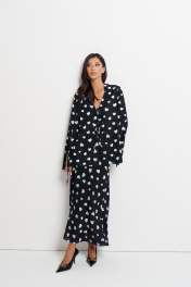 Юбка свободного кроя А образного силуэта выполнена из черного полотна с белыми сердечками. Характеристики: А образный силуэт, свободный крой, пояс на резинке, подкладка. Длина 95 см.