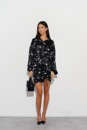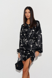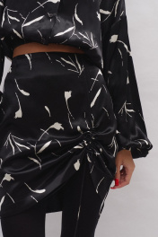 Юбка прилегающего силуэта выполнена из струящейся ткани с контрастным принтом. Характеристики: прилегающий силуэт, подкладка, застежка потайная тесьма молния в среднем шве заднего полотна изделия, по переду юбка драпируется при помощи декоративного шнура выполненного из ткани основного изделия. Длина 46 см.