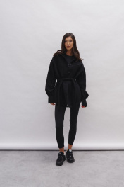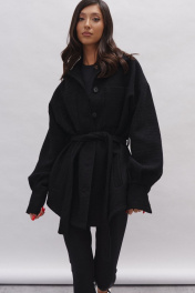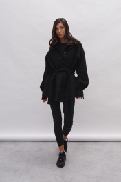 Жакет прямого кроя выполнен из фактурного полотна черного цвета. Характеристики: прямой крой, подкладка, отложной воротник на стойке, застежка центральная на петли пуговички, по переду крупные накладные карманы, по низу прорезные карманы, рукав свободного кроя- спущен, по низу рукава широкая манжета на пуговичке, по линии талии нашиты шлевки , в комплекте пояс из ткани основного изделия. Длина по спинке 75 см, длина рукава 85 от края горловины.