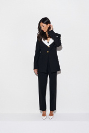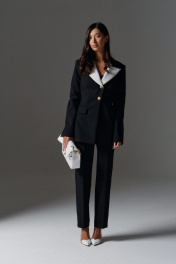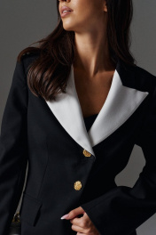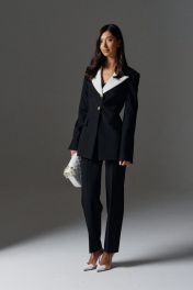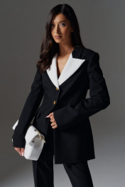 Жакет полуприлегающего силуэта с контрастными лацканами выполнен из костюмной ткани черного цвета. характеристики: полуприлегающий силуэт, подкладка, подплечники, отложной воротник с остроугольными контрастными лацканами, застежка центральная на петли пуговицы, пуговицы декоративные цвета золото, по переду карманы с клапанами, рукав втачной по низу рукава разрез. Длина по спинке 73 см, длина рукава 67 см.