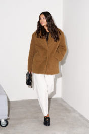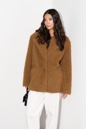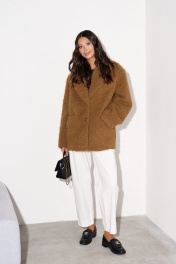 Пальто-пиджак прямого свободного кроя выполнен из фактурной мягкой ткани, коричневого цвета. Характеристики: прямой свободный крой, подкладка, подплечники, воротник с остроугольным лацканом, застежка центральная на петли - две пуговицы, по переду функциональные карманы с клапаном, рукав втачной, спинка цельнокройная. Длина по спинке 80, длина рукава 61 см.