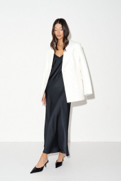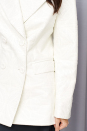 Жакет двубортный. Выполнен из фактурной эко-кожи белого цвета с вышивкой. Есть подклад. Приталенный силуэт. Воротник отложной с остроугольным лацканом. Рукав втачной, на рукаве петли-пуговицы (нефункциональные, декорированы эко-кожей в тон основной ткани). Есть подплечники. Карманы по переду внизу с клапаном. Застёжка петли-пуговицы. В среднем шве спинки шлица 18 см. Длина рукава 61 см. Длина спинки 69,5 см
