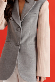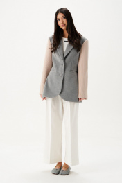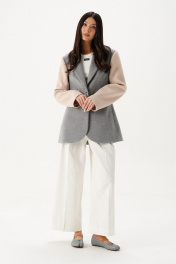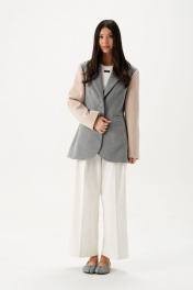 Жакет прилегающего силуэта. Выполнен из пальтовой ткани серого цвета в комбинации с пальтовой фактурной тканью бежевого цвета. Воротник отложной с лацканами. Рукав втачной. Есть подкладка. По переду вверху имитация карманы с листочкой, внизу функциональные карманы с листочкой. Застёжка центральная петли-пуговицы. Длина спинки 74 см, длина рукава 64 см