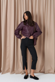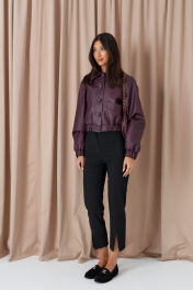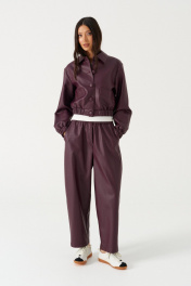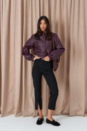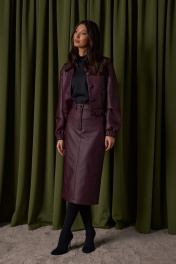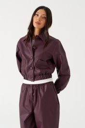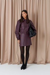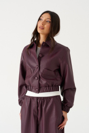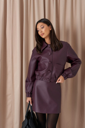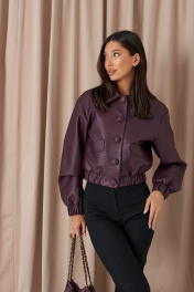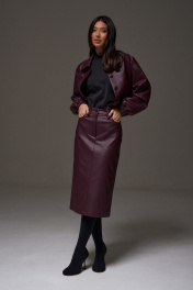 Куртка. Выполнена из фактурной эко-кожи бордового цвета. С подкладкой. Воротник отложной. Рукав втачной, немного спущен, с мантежой на резинке. Низ изделия с резинкой. По переду прорезные карманы. Застёжка центральная пуговицы. Длина спинки 49 см. Длина рукава от линии втачивания 61 см*жакет дополнит юбка а1611