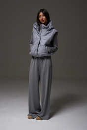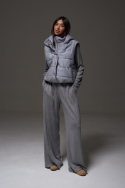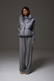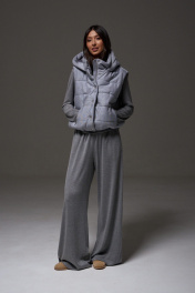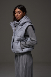 Жилет укороченный, выполнен из стеганной трикотажной ткани серого цвета. Характеристика: жилет А-силуэта, вортник стойка, капюшон цельный с жилетом, центральная застежка на молнию, скрывается под планкой на кнопках, боковые карманы на молнии, по низу изделия резинка с фиксаторами, брендированный подклад, спинка цельнокройная. Длина изделия от края горловины по спинке 58см.