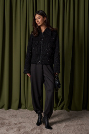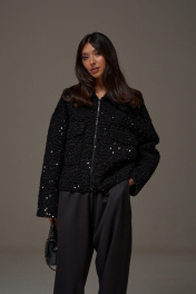 Жакет прямого свободного кроя. Выполнен из фактурной плотной (пальтовой) ткани чёрного цвета с пайетками. С подкладкой. Воротник отложной. Рукав втачной, спущенный. Застёжка центральная - молния. По переду накладные карманы с клапаном (с боковым входом). Спинка цельнокроеная. Длина рукава от линии втачивания 54 см. Длина спинки 59 см