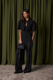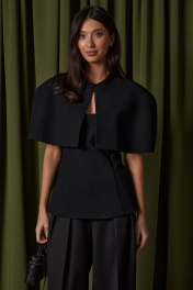 Кейп выполнен из костюмной ткани черного цвета. Характеристики: горловина стойка, застежка центральная на крючок, подплечники, брендированная подкладка. Длина по спинке 33см.
