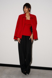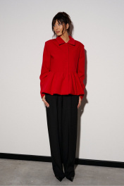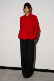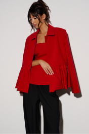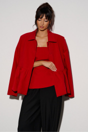 Жакет прямого кроя, с баской по нижней части изделия. Выполнен из костюмной ткани. Характеристики: брендированая подкладка, отложной воротник, застежка центральная на пуговички, рукав втачной. Длина по спинке от края горловины 61 см, длина рукава 83 см.