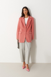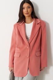 Жакет прямого свободного кроя. Выполнено из пальтовой ворсовой ткани нежного розового цвета. Характеристика: брендтрованная подкладка, воротник отложной с лацканами, рукав втачной и чуть спущен, по переду карманы с клапанами, застёжка центральная - пуговицы, в среднем шве заднего полотна шлица (29,5 см). В комплекте пояс из ткани основного изделия. В комплекте идет пояс из основной ткани изделия. Длина спинки 78 см. Длина рукава от линии втачивания 62 см