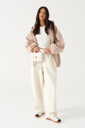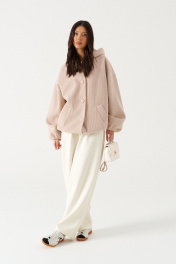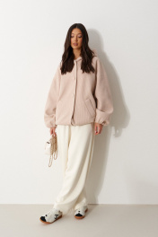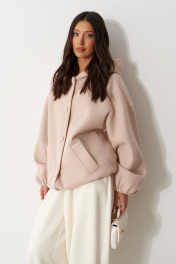 Жакет (бомбер), прямого силуэта , на подкладке. Выполнен из фактурной пальтовой ткани бежевого цвета. Характеристика: горловина круглая с притачным капюшеном. Линия плеча спущенная. Рукав длинный, одношовный, втачной. По низу присборен на резинку. По деталям полочки прорезные карманы с накладными листочками. Спинка цельная. Застежка центральная бортовая, застегивающаяся на прорезные петли и пришивные пуговицы. Длина рукава от горловины 78см, длина по спинке 71 см.