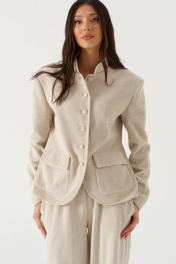 Жакет прямого кроя, выполнен из трикотажного полотна штрукса молочного цвета. Характеристики: прямой крой, на брендированной подкладке, воротник стойка, застежка центральная бортовая, застегивающаяся на пробивные петли и пришивные пуговицы, накладные карманы с клапанами, спинка цельная, талиевые выточки, рукав втачной, подплечник. Длина рукава от шва втачивания 62см. Длина изделия по центру спинки 62см.