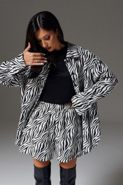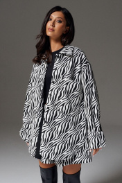Рубашка прямого свободного кроя выполнена из полотна с анималистическим контрастным принтом. Характеристики: прямой свободный крой, отложной воротник, застежка центральная - петли пуговички, рукав слегка спущен по низу рукава широкая манжета на пуговичках, по переду изделия крупные ассиметричные карманы, спинка отрезная с декоративной сборкой, низ в изделии с плавным срезом, в боковых швах разрезы. Длина спинке 80 см, длина рукава 77 см от края горловины.