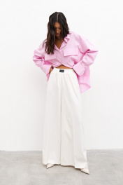 Рубашка прямого свободного кроя выполнена из розового полотна в белую полоску. Характеристики: прямой свободный крой, отложной воротник на стойке , застежка центральная на петли пуговицы, рукав спущен, по низу рукава манжета на пуговичках, по переду крупные накладные карманы, спинка отрезная с защипами, низ изделия с плавным срезом. Длина по спинке 77 см, дли на рукава от края горловины 78 см.