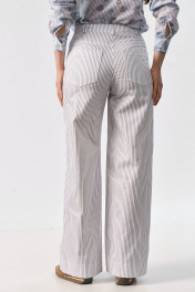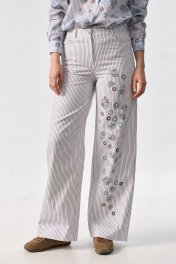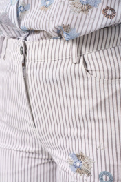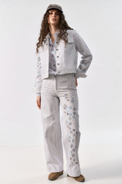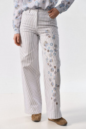 Брюки женские прямые, выполненные из джинсовой ткани. Натуральная хлопковая ткань обеспечивает отличную воздухопроницаемость и гигроскопичность. На передних половинках брюк обработаны карманы. На задних половинках обработаны кокетки. Длина по боковому шву 107, 107, 107, 107