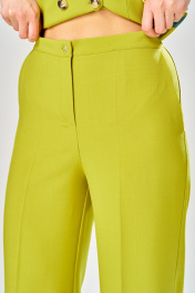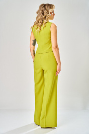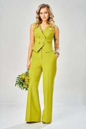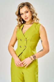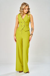 женский укороченный с фигурной линией низа, без воротника, с центральной бортовой застежкой на 3 петли и пуговицы. Перед с рельефами от проймы до низа. Спинка со средним швом, с рельефом от проймы до низа. Жилет на подкладке. Брюки-палаццо прямого силуэта, расклешённые к низу, с застежкой на тесьму-молнию, с гульфиком и откоском в среднем шве. Пояс притачной, застегивающихся на одну прорезную петлю и пуговицу, с 5 обработанными шлевками под ремень. По задней части в пояс вставлена эластичная тесьма. Задние половинки брюк с двумя таллиевыми выточками. Передние половинки брюк с боковыми косыми карманами. Длина жилета по спинке р.46-50 - 49 см, в р.52,54 – 52 см. Длина брюк 114 см.