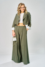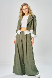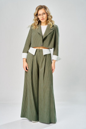 Костюм женский, состоящий из брюк палаццо и укороченного жакета. Костюм выполнен из текстильной ткани. Брюки прямого силуэта с застежкой на тесьму-молнию, с гульфиком и откосом в среднем шве, с притачным поясом, застёгивающимся на потайной крючок. Пояс с 5 шлевками для ремня и съемным воротничком из отделочной ткани. Съёмный воротничок пристёгивается на 7 прорезных петель по поясу и 7 пуговиц по воротничку. Задние половинки брюк с таллиевыми выточками. Передние половинки брюк с боковыми косыми карманами и с 2 складками от шва притачивания пояса. Жакет прямого силуэта длиной до линии талии с центральной бортовой застежкой на одну прорезную петлю и пуговицу. Перед с нагрудными выточками, выходящими из бокового шва. Спинка со средним швом. Воротник пиджачного типа с отложными лацканами. Рукава длинные, втачные, двухшовные, с передним и локтевыми швами. В нижней части локтевого шва обработан разрез. Низ рукава фигурный на откачке из отделочной ткани. Жакет на подкладке с плечевыми накладками.