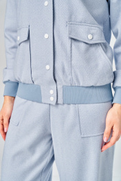 Комплект женский состоит из брюк и бомбера, выполнен из текстильной ткани. Брюки прямого силуэта, с притачным поясом. Внутри пояса эластичная тесьма, и проложены две строчки. По центру переда пояса обработаны две прорезные петли, в которые протянут шнур. На передних половинках брюк обработаны боковые накладные карманы с косым входом. Задние половинки брюк без конструктивных элементов. Бомбер на подкладке, свободного силуэта с притачной по низу планкой из отделочной ткани. Внутри планки эластичная тесьма. Застежка центральная бортовая на 7 кнопок. Бомбер с воротником-стойка из отделочной ткани. Перед с накладным карманом и клапаном с одной кнопкой. Рукава на спущенной пройме, длинные, одношовные с притачной по низу манжетой из отделочной ткани. Длина жакета по спинке 66см, длина рукава 60 см, длина брюк 111 см.