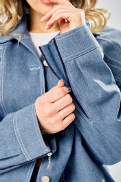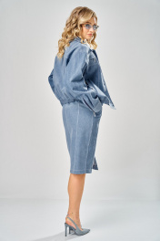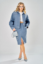 Комплект женский выполнен из джинсовой ткани, состоит из куртки и юбки. Куртка джинсовая свободного силуэта, со спущенной линией плеча. Куртка с центральной бортовой застежкой на 6 прорезных петель и пуговиц. Воротник отложной без стойки. По низу изделия притачная планка, внутри которой эластичная тесьма. Спинка с кокеткой и рельефами от планки низа до кокетки. Перед с рельефами от плечевого шва до шва притачивания планки низа, с прорезными карманами с листочкой с настрачными концами. По переду в верхней части обработаны имитации кармана с декоративной тесьмой-молнией. Рукава длинные на спущенной пройме двухшовные с притачными по низу манжетами. По шву притачивания манжет обработаны складки, в локтевом шве обработана тесьма молния. По изделию проложены отделочные строчки контрастного цвета. Куртка без подкладки. Юбка джинсовая миди, зауженная к низу, с застежкой по переду на тесьму-молнию в среднем шве, с гульфиком и откоском. Пояс притачной, застегивающихся на одну прорезную петлю и пуговицу, с 5 шлевками под ремень. По заднему полотнищу в пояс вставлена эластичная тесьма. Переднее полотнище с боковыми карманами со скосом, с хольнитенами у бокового шва и у шва притачивания пояса, с рельефом от кармана до низа. Заднее полотнище юбки со средним швом и рельефами от шва притачивания пояса до низа. По изделию проложены отделочные строчки контрастного цвета. Длина куртки 59 см, длина рукава 59 см, длина юбки 70 см в р.46-50 и 73 см в р.52-56.