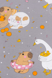 Комплект постельного белья Премиум (бязь). Размер: 1,5-спальный Состав: 100% хлопок Тип ткани: Бязь Премиум Пододеяльник 1 шт: длина 215 см, ширина 143 см Простыня 1 шт: длина 215 см, ширина 150 см Наволочки 2 шт: 70*70 см Постельное белье с капибарой, гусями и котятами из поплина – настоящая находка для создания уютного уголка. Забавные и симпатичные герои, экологичные и гипоаллергенные материалы, нежные оттенки – комплект из 100% хлопка подарит каждому ребенку чудесные сны и пригласит мальчишек и девчонок в мир сказки. «Капигуси» – рисунок, который наполнен очарованием и мягкостью. Он украсит детскую комнату и принесет радостные эмоции/порцию обнимашек.
