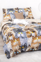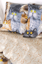 Постельное белье с котиками всегда популярно. Мурчащие котята ассоциируются с мягкостью, нежностью, спокойствием. Они поднимают настроение и дарят ощущение комфорта и уюта. Вот и наш дизайн «Муррито» вызывает море ярких эмоций. Ведь здесь самые разные усатые-полосатые. Все они очень пушистые, милые, смешные и обаятельные. Комплект из бязи с таким необычным рисунком украсит и детскую, и комнату подростка. Яркий акцент в Вашем доме! Размер: 1,5-спальный Материал: Бязь. Состав: Хлопок 100%. Плотность ткани: 120 гр./м.кв. Пододеяльник: 1 шт. - 215*143; Простыня: 1 шт. - 220*150; Наволочка: 2 шт. - 70*70;