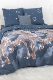 Главная фигура нашего дизайна – величественный пегас, родом из старинных мифов. Он олицетворяет свободу, мечту, скорость, вдохновение и особенно понравится тем, кто хочет окружить себя атмосферой сказки и творчества. Пегас изображен в динамике: он летит сквозь облака, широко расправив крылья. На фоне изображено бескрайнее небо, которое дополняет общий рисунок и придает принту нотки фэнтезийной романтики. Если вы мечтаете об уютном уголке в комнате и выбираете подарок на Новый год 2026, то постельное белье с лошадью из бязи отлично подойдет для этих целей. «Пегас» добавит нотки волшебства, загадочности и спокойствия в Вашу спальню! Размер: 1,5-спальный Материал: Бязь. Состав: Хлопок 100%. Плотность ткани: 120 гр./м.кв. Пододеяльник: 1 шт. - 215*143; Простыня: 1 шт. - 220*150; Наволочка: 2 шт. - 70*70;