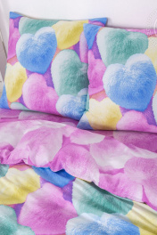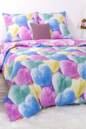 Комплект постельного белья Премиум (бязь). Размер: 1,5-спальный Состав: 100% хлопок Тип ткани: Бязь Премиум Пододеяльник 1 шт: длина 215 см, ширина 143 см Простыня 1 шт: длина 215 см, ширина 150 см Наволочки 2 шт: 70*70 см «Шерри» – комплект постельного белья с сердечками из ткани бязь. Оно сочетает в себе практичность материала и нежность дизайна. Композиция состоит из мягких и пушистых сердец, выполненных в популярных оттенках. Рисунок милый, очаровательный и плюшевый. Он дарит ощущение весны, радости и мечтательности. Трендовый принт с сердечками понравится и детям, и подросткам, и взрослым. Это яркое дополнение для Вашей комнаты!