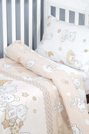Комплект постельного белья (поплин). Размер: Детский (в кроватку) Пододеяльник 1 шт: длина 147 см, ширина 112 см Простыня 1 шт: длина 150 см, ширина 100 см Наволочка 1 шт: 40*60 см Особенности отделки: пододеяльник с карманом, наволочка с клапаном