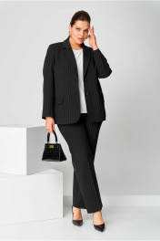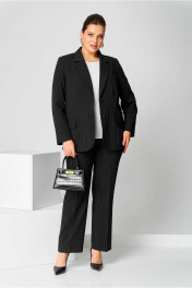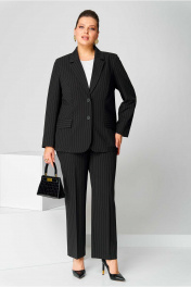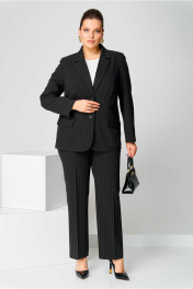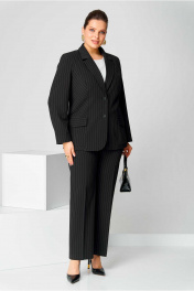 Костюм брючный (двойка) женский полуприлегающего силуэта, состоит из жакета и брюк. Костюм выполнен из костюмной ткани в полоску. Изделие на подкладке. Жакет с бортами и двухшовными рукавами. Перед с центральной застежкой на пуговицы. Рельефы из проймы до низа. В области ниже талии накладные карманы с клапанами. По низу переда борта с закруглениями. Спинка с центральным швом. Брюки классические, со стрелками на поясе с резинкой. Застежка на гульфик, на тесьму-молнию. Вверху косые карманы. Длина изделия жакет - 71 (±1) см., брюки - 100 (±2) см. Длина рукава 61 (±1) см. Объём груди размер 50 – 110 (±2) см.; размер 52 – 114 (±2) см.; размер 54 – 118 (±2) см. Объём талии жакет: размер 50 – 103 (±2) см.; размер 52 – 107 (±2) см.; размер 54 – 111 (±2) см. брюки: размер 50 – 80 (±2) см.; размер 52 – 84 (±2) см.; размер 54 – 88 (±2) см. Объём бёдер жакет: размер 50 – 120 (±2) см.; размер 52 – 124 (±2) см.; размер 54 – 128 (±2) см. брюки: размер 50 – 104 (±2) см.; размер 52 – 108(±2) см.; размер 54 – 112 (±2) см. Ширина рукава под проймой размер 50 – 20 (±1) см.; размер 52 – 21 (±1) см.; размер 54 – 22 (±1) см.