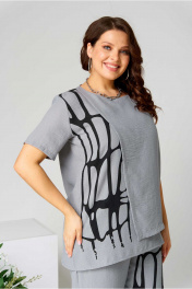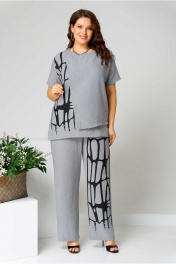 Костюм брючный (двойка) женский свободного силуэта, состоит из блузки и брюк. Блузка с коротким рукавом. Перед с отлетной финурной асимметричной кокеткой. Современный крой с принтом. Брюки на резинке, с косыми карманами. Длина изделия: блузка - 71 (±1) см., брюки - 102 (±2) см. Длина рукава 22 (±1) см. Объём груди размер 48 – 112 (±2) см.; размер 50 – 116 (±2) см.; размер 52 – 120 (±2) см.; размер 54 – 124 (±2) см. Объём талии блузка: размер 50 – 116 (±2) см.; размер 52 – 120 (±2) см.; размер 54 – 124 (±2) см. брюки: размер 48 – 68 (±2) см.; размер 50 – 72 (±2) см.; размер 52 – 76 (±2) см.; размер 54 – 80 (±2) см. Объём бёдер брюки: размер 48 – 108 (±2) см.; размер 50 – 112 (±2) см.; размер 52 – 116(±2) см.; размер 54 – 120 (±2) см. блузка: размер 48 – 106 (±2) см.; размер 50 – 110 (±2) см.; размер 52 – 114(±2) см.; размер 54 – 118 (±2) см. Ширина рукава под проймой размер 48 – 17.5 (±1) см.; размер 50 – 18.5 (±1) см.; размер 52 – 19.5 (±1) см. размер 54 – 20.5 (±1) см. Ширина спинки 38 (±1) см.;
